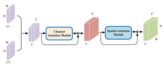 Improved network structure by using attention mechanism. W and H are the width and height of the input data during the training process of the convolutional neural network, C, C1 and C2 are the number of channels in the middle, and F, F’, and F” are the features of the training process, respectively.