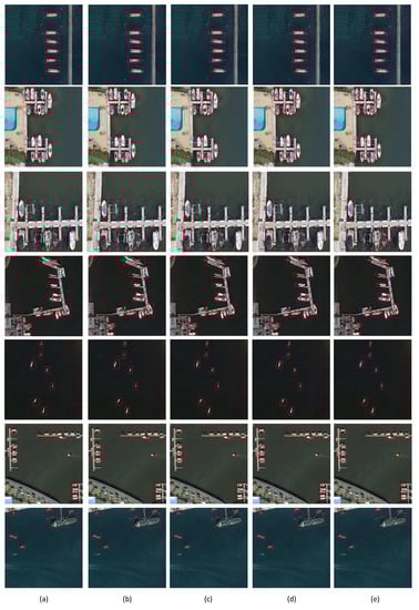 Comparison of the ship detection results by different methods. (a) SSD. (b) YOLOv3. (c) Faster R-CNN. (d) Method in [39]. (e) Ours.