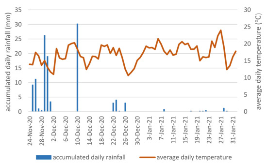 Average daily temperature (red line) and accumulated daily rainfall (blue bars) recorded by the weather station at Palliser Estate between 27 November 2019 and 1 February 2021.