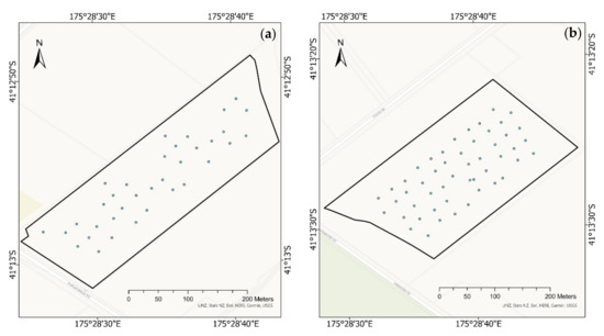 The trials reported in this paper took place from late November 2020 to early February 2021 to match the most critical period for GWS management. The measurement dates, that avoided rain days, were 27 November 2020, 4 December 2020, 14 January 2021, and 22 January 2021 at Wharekauhau, and 4 December 2020, 14 January 2021, 22 January 2021, and 1 February 2021 at Pencarrow.