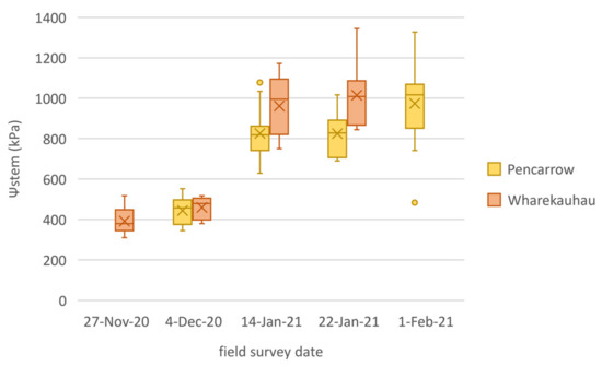 Boxplot of stem water potential (Ψstem) values for the full set of samples collected at Wharekauhau (n = 35) and Pencarrow (n = 50) vineyard.