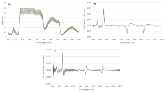 Raw hyperspectral signatures (a) and their first (b) and second (c) derivatives for all samples (n = 85).