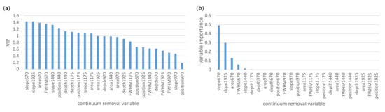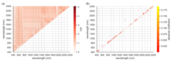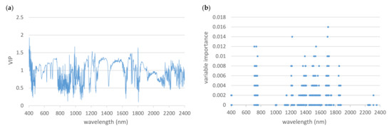 PLSR carries out dimensional reduction through generating independent components which linearly integrate the maximum variance in the predictor variables under the supervision of response variables [61]. It then performs least squares regression on these components with the response variables. This technique is useful in addressing datasets with problems associated with multicollinearity and high dimensionality, and preventing overfitting [36]. Both predictor and response variables were scaled during modeling. PLSR evaluates the significance of each variable by calculating the variable importance of projection (VIP) [62]. The higher the VIP value of a variable, the more important the corresponding spectral data is to the PLSR.