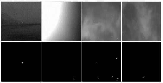 The detection of infrared small targets plays a critical role in infrared search and tracking systems, military early warning systems, remote sensing systems, and other applications owing to the ability of infrared radiation to penetrate obstacles such as fog and other atmospheric conditions and that of infrared sensors to capture images regardless of lighting conditions [1]. Such target detection systems employ passive sensors with low observability, and the all-weather, multi-scene nature of infrared imaging contributes to its suitability in a wide range of applications. With the rise in unmanned aerial vehicles, the use of infrared sensors for field detection and rescue has further enriched the application scenario of infrared target detection. However, because of the long infrared imaging distance and low-resolution, infrared targets usually have a low signal-to-noise ratio, and dim and small target profiles exhibit limited shape features and are, thus, easily submerged in strong noise and background cluster, as shown in Figure 1. Because of these attributes, infrared small target detection remains challenging and has attracted considerable attention.