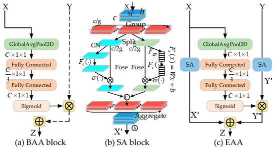 The up-sampling (decoding) process fuses the feature map information output using the encoder module by skipping connections, as well as using additional contextual and spatial information of the feature map from the low-resolution decoder block. We propose an EAA module, which mainly consists of two components—a bottom-up asymmetric attention (BAA) block and a shuffle attention (SA) block, as shown in Figure 3. The BAA block enables cross-layer feature fusion and highlights the fine details of a target. The SA block focuses on spatial and channel feature information within layers through channel shuffling, captures the spatial and channel correlation between features based on contextual information and weight selection regions, and enhances the spatial and channel information exchange of features to improve the performance of the proposed approach. In this subsection, we present the details of the entire module.