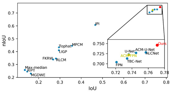 Table 3 details the quantitative results of IoU, nIoU, and inference speed for all the methods, and Figure 4 shows a visual comparison in terms of IoU and nIoU; EAAU-Net achieved the best performance in terms of both IoU and nIoU. The significant increase in these values demonstrates that our proposed algorithm significantly improved in terms of accuracy for the shape-matching of prior infrared small targets. The SIRST dataset contains challenging images with different signal-to-noise ratios, background clutter, target shapes, and target sizes; this suggests that our proposed method can learn distinguishing features that are robust to scene variations. Furthermore, as illustrated in Figure 4, the deep-learning-based algorithm achieved a significant improvement over methods based on handcrafted aspects, which are traditionally designed for specific scenes (e.g., specific target sizes and clutter backgrounds), and manually selected parameters (e.g., structure size in top-hat filters and block size in IPI) limit the generalisation performance of these methods.