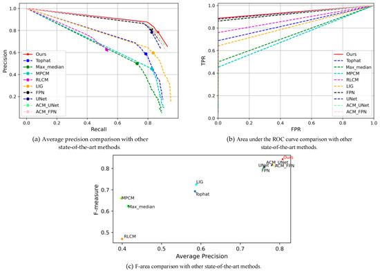 Performance of state-of-the-art methods on the SIRST dataset: (a) PR curve, (b) area under the ROC curve, and (c) F-area.