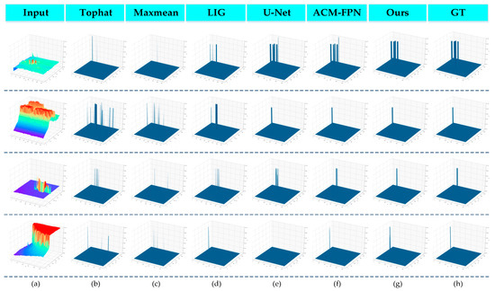 (2) Qualitative results: Figure 6 shows the 3D visualisation qualitative results of the traditional handcraft-based method and the CNN-based method. Compared with the traditional method, our proposed method was able to produce accurate target localisation and shape segmentation output at a very low false alarm rate. The traditional handcrafted setting-based method is prone to producing several false alarms and missed regions in complex scenes (as shown in Figure 6a,b), owing to the fact that the performance of traditional methods relies heavily on manually extracted features and cannot adapt to changes in the target size. CNN-based methods (i.e., U-Net and ACM-FPN) perform much better than traditional methods. However, U-Net also appears to lose targets (as shown in Figure 6e). EAAU-Net is more robust to these scenario changes. In addition, EAAU-Net was able to generate better shape segmentation than ACM-FPN. This is because we designed the EAA module to help the network adapt well to various types of background clutter, target shapes, and target size challenges using bottom-up cross-layer feature fusion and exchange of channel and spatial information between the same layers, resulting in better performance.