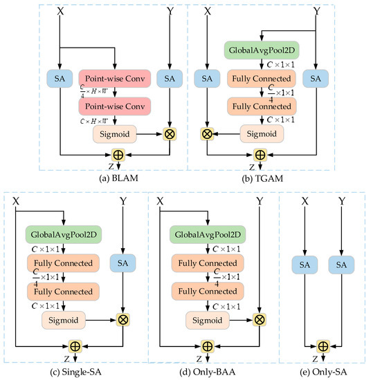 Architectures used in the ablation study on modulation scheme. (a) Bottom-up modulation with point-wise channel attention module (BLAM). (b) Top-down modulation with global channel attention module (TGAM). (c) Bottom-up modulation with single-SA attention module (single-SA). (d) Only bottom-up modulation module (only-BAA). (e) Only SA block modulation (only-SA). All architectures shared the same hyperparameters.