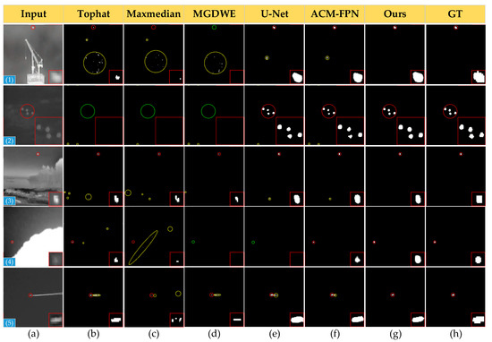 Qualitative results obtained with different infrared target detection methods.