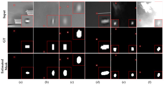 Although our proposed method achieves better performance, it also has the limitation of not being able to accurately segment the boundaries of infrared small targets. Figure 10 shows a partial visualisation of the output of the results of the proposed EAAU-Net on the SIRST dataset. The manually labelled ground truth is ambiguous in terms of one- or two-pixel shifts and had a significant impact on our final IoU and nIoU metrics; for example, a 2 × 2-pixel pinpoint target with even a single pixel of shift would result in the pixel being labelled as 3 × 3; this would result in an error of approximately 50% for that target. Therefore, the proposed EAAU-Net suffers from a certain degree of segmentation error (as shown in Figure 10b,c), which originates from target boundaries that either exceed the labelling mask by a few pixels or segment the target incompletely. Such boundary errors are also present in general vision tasks. Notably, errors are inevitable in manually labelled masks, and the proposed EAAU-Net was able to produce more accurate segmentation results than manually labelled ground truth masks (shown in Figure 10d,e).