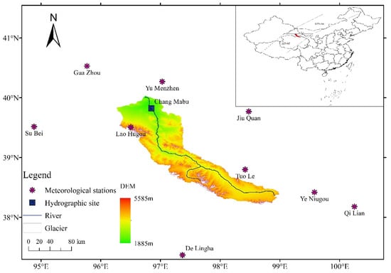 The runoff data were obtained from the Gansu Provincial Bureau of Hydrology and Water Resources, which collects daily runoff data from the Changmabu hydrological station in the region. The time series is from1 January 2000 to 31 December 2019. The digital elevation data were downloaded from http://www.gscloud.cn/ (accessed on 20 March 2021), with a resolution of 30 m.