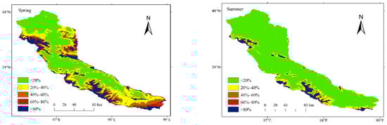 Spatial distribution of snow cover frequency in the upper reaches of the Shule River in different seasons.