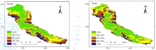 The AWS (automatic weather station) of the Qilian Shan station was selected to validate the MODIS snow cover data using the relationship between albedo and the snow cover frequency. Considering the large albedo difference between the snow cover and land surface, the relationship between the snow depth and albedo of grassland, sandstone, and other types was generally good and not greater than 0.35. Previous studies that used MODIS data to investigate the snow cover in the Qilian Mountains [,,] reported a threshold snow cover index value of 0.35 to distinguish the snow cover.