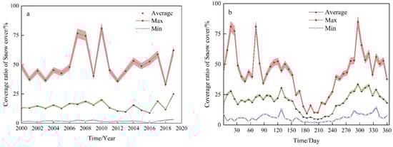 Variations in snow cover range in the upstream region of the Shule River catchment: (a) interannual variation; (b) 8-day interval variation.