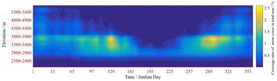 The average snow cover frequency in 2000–2019 was used to analyze the snow pattern cover at different altitudes (Figure 4). The relatively high snow cover frequency in spring, autumn, and winter was mainly distributed in areas with altitudes of 3200–3900 m. The annual snow cover variations show significant differences with altitude, following a bimodal pattern. There was less snow at altitudes below 2800 m. The snow cover showed an increasing fluctuation pattern in mid-August in areas with an altitude of 2800–3900 m, and then it melted from early March to late May in the following year. The areas located at 3900–4500 m showed an increase in the snow cover extent in mid-October, which then turned to melt in early March in the following year, and melting ended in late April. The snow cover extent in areas above 4500 m was relatively large and varied only slightly from mid-April to mid-September; however, the snow cover rapidly increased in late September owing to reduced temperatures and peaked in late October. The ratio between the snow cover and total area then decreased owing to the low temperature and low precipitation and was less than that in spring and autumn. This is consistent with the annual variations in the snow cover extent at high altitudes in the Qinghai–Tibet Plateau including the West Kunlun Mountains [,,].