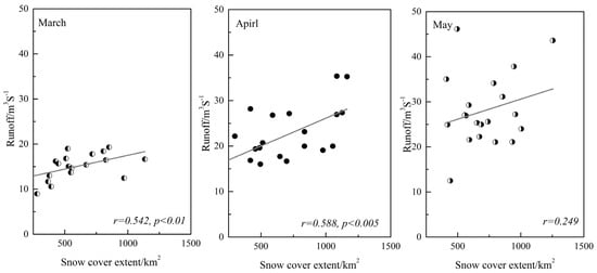 The snow cover extent and runoff for the 8-day interval results and monthly and average values were compared in March–May (Figure 5). The results show the strongest correlation in April, followed by March, and a significant decrease in May. A possible explanation is the initial snowmelt in March, at which time the hydrological effect has not yet appreciably formed. In April, significant warming and a slight increase in precipitation highly strengthened the snowmelt and led to the peak contribution of the melted snow cover to runoff. The correlation then decreased and did not clearly reflect the importance of the role of the reduced snow cover extent in runoff owing to the changed form of snowmelt with decreasing thickness, glacier melt, and increasing precipitation.