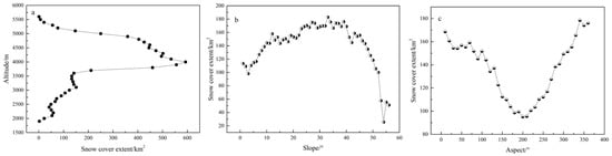 Topography is an important factor that affects the snow cover distribution. In this study, a correlation analysis was conducted between the snow cover extent, altitude, slope, and aspect (Figure 7). The areas with a higher snow cover frequency were mostly concentrated in high-altitude areas. Higher altitudes were associated with stronger correlations between the snow cover frequency and altitude. The snow cover frequency and slope also showed a distinct relationship. A strong positive correlation was observed in areas with slopes less than 30°, whereas areas with slopes greater than 45° showed that the snow cover frequency decreased with increasing altitude, resulting in a negative correlation, and areas with slopes of 30°–45° showed no variation. The correlation analysis between the snow cover frequency and slope aspect indicated symmetrical changes. The snow cover frequency varied slightly in the southern slope and showed a large correlation with the slope aspect, whereas that in the northern slope varied greatly and showed little correlation with the slope aspect. Greater snow cover was observed on the northern slope than on the southern slope, which may be related to the source of water vapor and influence of solar radiation.