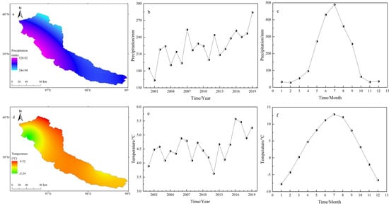 Temperature and precipitation are two important meteorological factors that determine the melting and accumulation of snow cover []. This work analyzed the potential relationship between the snow cover and temperature/precipitation and found a relatively large sensitivity to altitude (Figure 8). Both temperature and precipitation significantly increased from 2000 to 2019, which is consistent with other results of climate changes in the Shule River catchment [,]. The monthly precipitation gradually increased in early March to a maximum in late July and then gradually decreased. The temperature was below 0 °C from late October to late February in the following year and gradually increased to above 0 °C in early March to a maximum in late July.