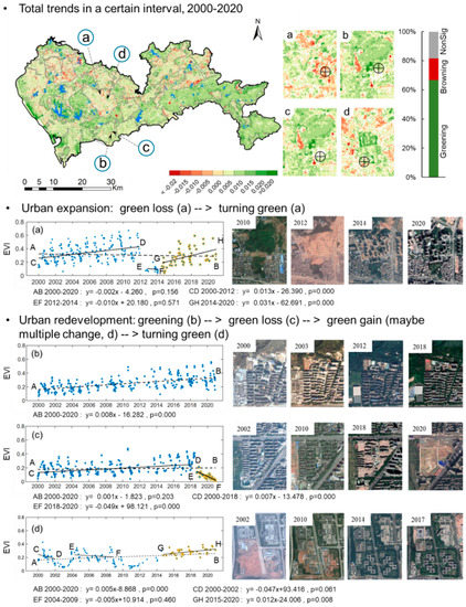 As shown in Figure 3a, the pixel experienced a changing process of urban expansion, in which the EVI abruptly decreased in 2012 and continuously increased in 2014–2020. Although a browning trend was found on Line AB with a slope of −0.002 (p = 0.156), two hidden greening trends, reflected from a positive slope of 0.013 (p = 0.000) in 2000–2012 and another positive slope of 0.031 (p = 0.000) in 2014–2020, were revealed from the process-based analysis.
