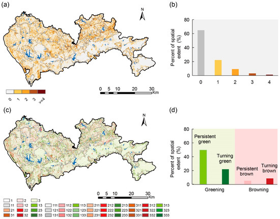 Spatial pattern of the change incident and process of vegetation change: (a) number of change frequency, (b) percent of each level on change frequency, (c) process of vegetation greenness, and (d) percent of greening and browning.