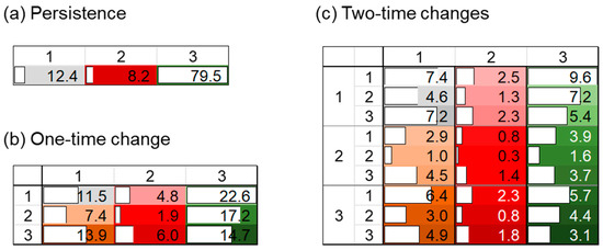 Matrix for the process of the urban vegetation dynamics. (a) persistent change, (b) process with one-time change, and (c) process with two-time changes. The values in the matrices represent the area proportion.