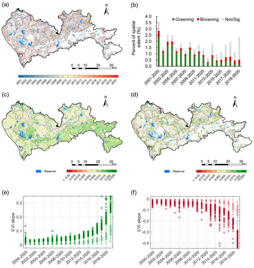 Spatial and temporal patterns of vegetation change in the recent period. (a) latest change year, (b) trends in the latest change period, (c) EVI slope with persistent change in 2000–2020, (d) EVI slope in the latest changing period, (e,f) data distribution of the EVI slopes in recent change period for greening and browning.