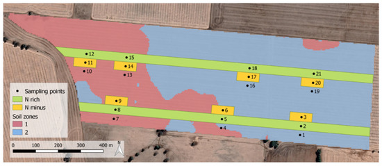 A 64-ha commercial wheat field cultivated under a no-tillage system near Tarlee in South Australia was used for this study during the 2019 season. An on-farm, spatially distributed experimental design [33] was implemented to use the range of variability in the field for the assessment of relationships between the various measured and sensed crop parameters. The design featured areas with different N rates (N ‘rich’ and N ‘minus’ strips) to maximize crop variability and sampling points scattered across the field area (Figure 1). N ‘rich’ strips were 39 m wide (equivalent to the width covered by a single pass of the fertiliser equipment) and approximately 1300 m long and crossed different soil zones previously identified in the field. These zones were defined based on clustering of soil information layers derived from electromagnetic induction (EM38 sensor, Geonics, Mississauga, ON, Canada), gamma radiometry (Mole gamma radiometer, The Soil Company, Groningen, The Netherlands) and soil pH (MSP sensor, Veris Technologies, Salina, KS, USA) surveys. There were seven shorter N ‘minus’ strips of 39 m by 100 m which were spread across the soil zones—three in each zone and one in an intermediate area. Sampling points were positioned to cover the range in N treatments and soil zones. At the beginning of crop stem elongation (Z31, [34]) on 1 August 2019, the crop was scanned with a mobile, ground-based, multi-sensor platform (see below) and plant samples were collected at the 21 sampling points. Plant samples consisted of two crop rows (spaced by 0.3 m) of 1 m length measured for above-ground dry biomass, N concentration and crop height; the average of five manual measurements of crop height was taken with the measurement aimed at the top of the canopy which was visually identified. By the time of crop scanning and sample collection, total applied N rates in the ‘minus’, ‘normal field’ and ‘rich’ treatments were 11, 57 and 141 kg N ha−1 (Table 1); fertiliser was applied with field machinery equipped with RTK-GNSS (Real Time Kinematics—Global Navigation Satellite System) guidance and variable rate technology.
