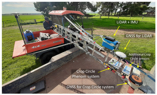 The sensors were mounted onto a platform attached to the side of an all-terrain vehicle with the LiDAR system at 1.3 m above the ground for a vertical scanning (nadir) of the crop (Figure 2 and Figure 3). The Crop Circle sensors were attached alongside the LiDAR system at 1 m above the ground. The sensors were arranged so that they did not block each other’s field of view (by facing opposite directions) whilst having an overlapping scanned area on the ground. For field scanning, the system was operated along 11 transects of the field (tramlines spaced by 39 m) at a travel speed of 2.2 m s−1.