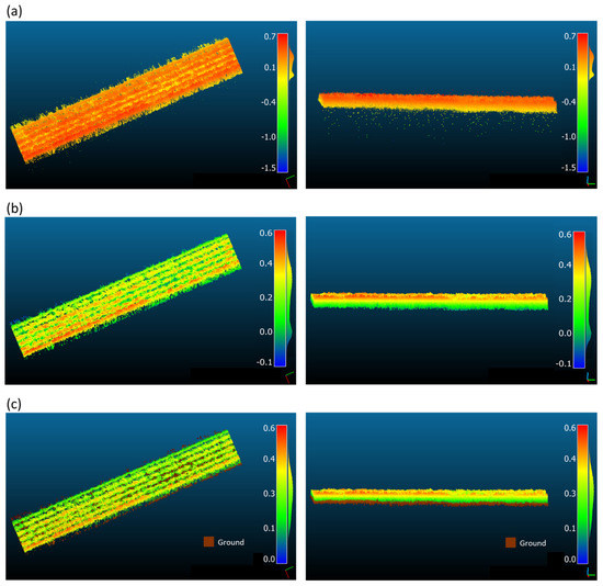 The LiDAR crop scanning resulted in approximately 884 million points across the 64-ha paddock. With a total scanned area of approximately 3 ha (4.5% of the total area) and an average point elimination of 7% of outliers, the ground point density was approximately 28,000 points m−2. Figure 5 illustrates the data processing steps from the raw data to the filtered and classified point cloud into ground and above ground points. Based on a visual inspection, both the filtering and classification steps seem to have worked satisfactorily. In Figure 5, the top figures show the raw point cloud with outlier points mostly in the bottom part of the cloud which were eliminated after filtering (middle figure); note that the point height ranged between −1.5 and 0.7 m before outlier elimination, and after filtering, points were concentrated mostly around the 0 and 0.3 m height levels. Figure 5 also shows that points closer to the ground level were classified as ‘ground’ points (bottom figure). Overall, the final processed point cloud was judged to have represented the crop in sufficient detail to distinguish different levels of crop cover and general development (Figure 6). The actual validation of the digital information generated from the LiDAR is provided below based on the ground truth plant measurement.