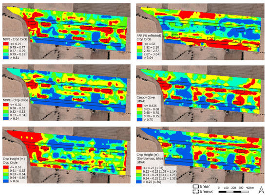 Maps derived from Crop Circle and LiDAR sensors in a 64-ha commercial wheat field in South Australia. Colour classes are divided by quantiles (i.e., 20th percentiles). Biomass values (bottom right map, shown in brackets) were converted from LiDAR-derived crop height values using a calibrated model (Figure 9).