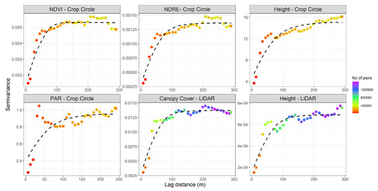 Variograms of each parameter derived from the Crop Circle and LiDAR scanning. NDVI, normalized difference vegetation index; NDRE, normalized difference red-edge index; PAR, photosynthetic active radiation (ratio between reflected and incident radiation).