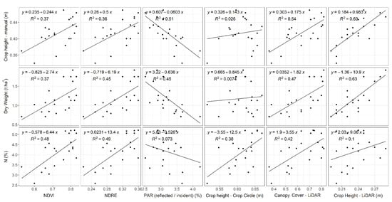 The relationships between sensed and measured crop parameters are shown in Figure 9 and Table 2. Overall, the LiDAR-derived crop height outperformed estimations of biomass from the Crop Circle sensor. As expected, NDVI and NDRE were influenced by both plant N concentration and dry biomass. Of interest, these indices were well correlated with total N uptake calculated as total N per unit area (crop dry weight multiplied by N%), with a coefficient of determination over 0.7 (data not shown). However, as noted above, N management practices underpinned by critical N levels depend on the information of biomass and N concentration independently. LiDAR-derived crop height was well correlated with crop biomass (R2 = 0.63, r = 0.79, root mean squared error (RMSE) = 218 kg ha−1), with no relationship with plant N concentration, which indicated that LiDAR-derived height is a more appropriate surrogate to crop biomass then spectral indices. LiDAR height was also reasonably correlated with manual measures of height, although it should be noted that the LiDAR sensor estimated the average point height of the canopy whereas the manual measures aimed to assess the height of the top of the canopy. LiDAR-derived canopy cover had a similar behaviour to NDVI and NDRE with a moderate relationship with both N concentration and crop biomass; canopy cover was highly correlated with NDRE and NDVI (see also maps in Figure 7).