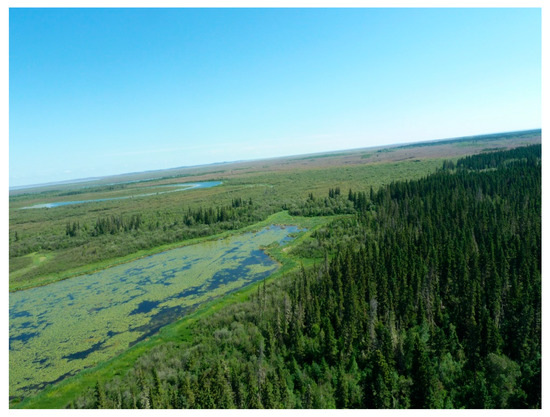 The PAD has been recognized as a primary habitat for a large range of insects, birds and mammals [29,30,31]. The vegetation cover, as reported on by Timoney [30], is affected by topography, frequency of flooding and depth to the groundwater table. Vegetation classes are generally organized along an elevation and moisture gradient: from forests (balsam poplar, white spruce) at the highest elevations, followed by thickets and savannahs (willows, grasses), marshes and meadows (sedges, grasses, rushes, cattails and reeds), and aquatic communities at the lowest elevations (algae-diatoms, bladderwort-duckweed-coontail, pond-lily) [29]. An example of such vegetation cover gradient and wetland channel complexes in the study area of interest within the Athabasca Delta are shown in Figure 2 and Figure 3.