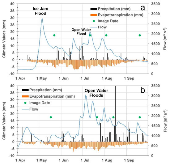 Compared to the 30-year mean climate, both study years 2018 and 2019 were slightly cooler than normal, received less than normal annual precipitation, and experienced above and below normal rates of total potential evapotranspiration, respectively (Table 2). Noteworthy to our analysis timeline was the spring ice-jam flood event of 2018 (later date of snowmelt as indicated by 0 °C isotherm, greater 1st of April snowpack index, and a larger spring peak flow magnitude coupled with mechanical ice breakup) around the lower Athabasca River, Embarras River and Mamawi Creek region that inundated adjacent lakes and wetlands in the delta floodplain covered by our AOI [42] (Figure 5). Furthermore, both summers experienced open-water flooding/connectivity events from high flows (i.e., >1750 m3 s−1) entering the Athabasca Delta as observed in several wetlands along the Mamawi Creek (unpublished data, Peters), with 2019 experiencing large and multiple summer overbanking events. Although the year 2019 had an earlier start to spring 0 °C isotherm, 2018 experienced considerably more potential evapotranspiration and less precipitation, leading to greater climatological net water loss during the growing season than in 2019 (i.e., precipitation minus potential evapotranspiration).