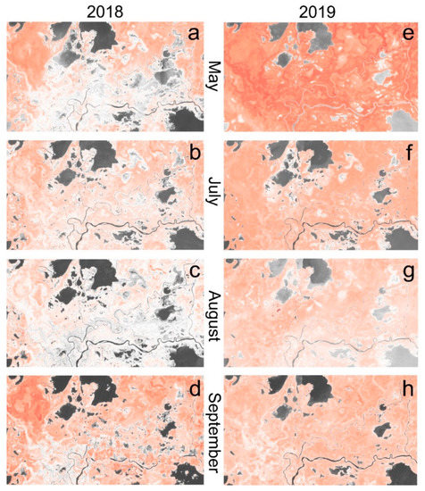 Summary images of changes to the Modified Normalized Difference Water Index (MDNWI) over the two time periods used in this work: May, July, August and September images for 2018 (a–d) and 2019 (e–h), respectively. Grey indicates increasing wetness and red increasing dryness; all images stretched from −1 (drier—red) to 1 (wetter—grey).