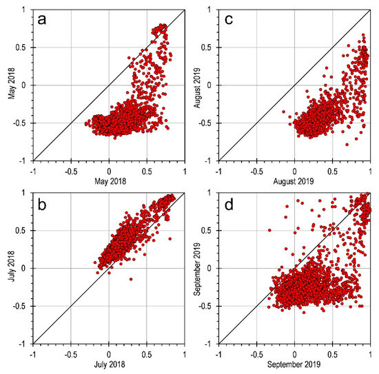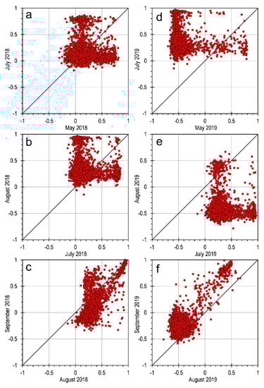 For a more detailed examination of the inter- and intra-year changes, we generated a set of 4000 randomly spaced points on which to base our sample. The distribution of these points is from south to north (see Figure 3 for polygons of points sampled), which corresponds to the observable variations in moisture content, especially as related to the 2018 flooding. These points were chosen because the areas bounded by the polygons: (i) encompassed the range of cover classes present in the study area; (ii) minimized the occurrence of standing water in the form of shallow ponds and lakes; and (iii) known to have experienced a range of flood timing and flood types. These same points were subsequently used below to address the changing vegetation indices. The intra-year comparison of the wetting patterns provided in Figure 7 shows that for 2018, there were inconsistencies between the early images. In comparing the July–August data, there was a general wetting of the area, while the August–September comparison was more organized, although the area was slightly wetter in the August scene. For 2019, the sample point comparison supports our more qualitative interpretation of Figure 6. Note that a 1:1 line was added to Figure 7 and Figure 8 to facilitate interpretation; in the case of no difference between the two periods, the points would lie on this line.