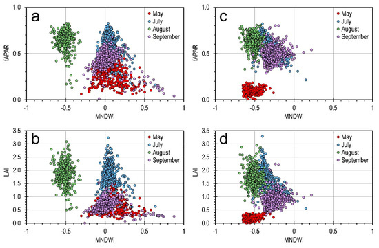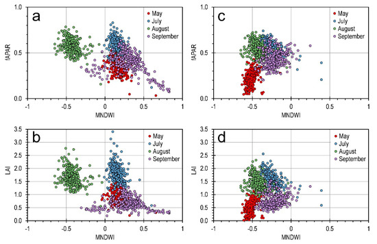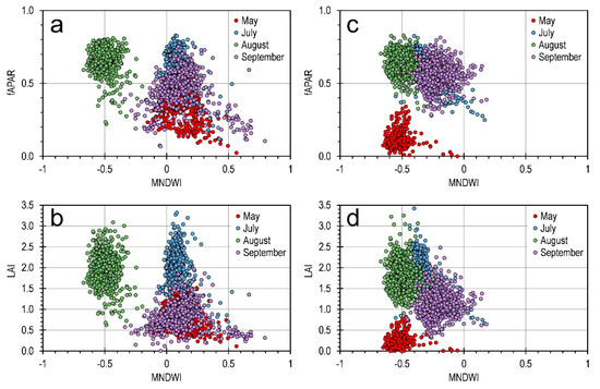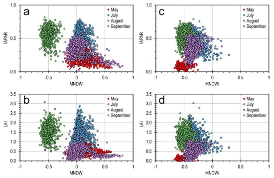 Comparison of Coniferous class leaf area index (LAI) and absorbed photosynthetically available radiation (fAPAR) vs. Modified Normalized Difference Water Index (MDNWI) indices for the 2018 (a,b) and 2019 (c,d) growing seasons.