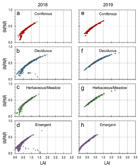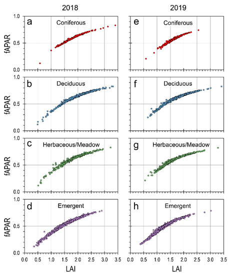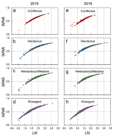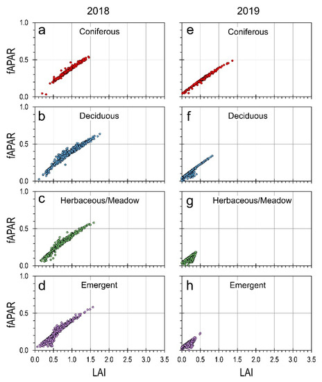 May comparison of absorbed photosynthetically available radiation (fAPAR) vs. emergent leaf area index (LAI) for the 2018 (a–d) and 2019 (e–h) for the Coniferous, Deciduous, Herbaceous/Meadow and Emergent classes.