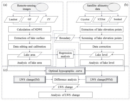 Content and method on (a) extraction of the lake area, (b) extraction of the lake water level, and (c) estimation of the lake water storage (LWS) change.