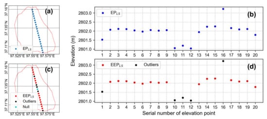 The (a) horizontal and (b) vertical distribution of the elevation points of the lake surface (EPLS); and the (c) horizontal and (d) vertical distribution of the effective elevation point (EEPLS) and outliers.