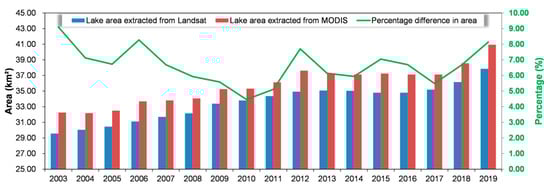As shown in Figure 5, the lake area extracted from Landsat and MODIS products over the same periods varied significantly. From 2003 to 2019, the annual lake area extracted by MODIS was 4.47–9.09% larger than that extracted by Landsat, with an average of 6.64%, and the difference became narrow with an increasing lake area (see the green solid line). This result is consistent with that of a previous study [22,57], in which the relative difference in lake area extracted by the two products was closely related to the scale of the lake.