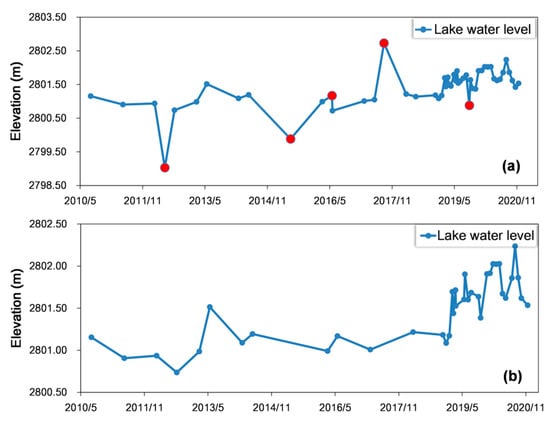 To extract the initial water level of Gahai Lake and form a time series, the proposed water-level extraction algorithm was used to calculate the data from three altimeter satellites that passed over Gahai Lake (see Figure 7a). The apparent deviation of water level from the data acquired on adjacent dates (see red solid circles) may result from an error in the original lake-elevation point. To further analyze this phenomenon, the number of lake elevation points (N_EPLS), the number of effective lake-elevation points (N_EEPLS), and the percentage of effective lake-elevation points (RE) were collected and compared for all periods of deviation in the water level, as indicated in Table 4. For the 14 periods when the lake water level deviated, there were fewer than 40% of the effective elevation points on the lake surface over 12 periods, which indicates that the original lake-elevation points were widely dispersed (see Figure 8a). There were two periods in which RE > 40%, but few initial lake-elevation points (see Figure 8b). These results suggest that the original lake-elevation points may not be reliable. Therefore, the ER and EPLS in 3.2.2 were set to 40% and 8, respectively, to eliminate these possible anomalous water levels from the time series of lake water levels. In the end, the water level of Gahai Lake was obtained, as shown in Figure 7.