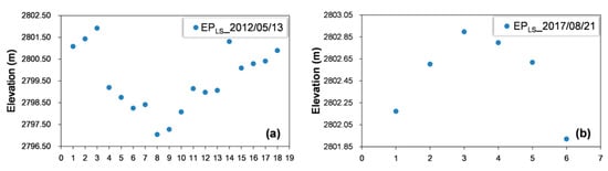 Distribution of elevation points on the lake surface on (a) 13 May 2012 and (b) 21 August 2017.