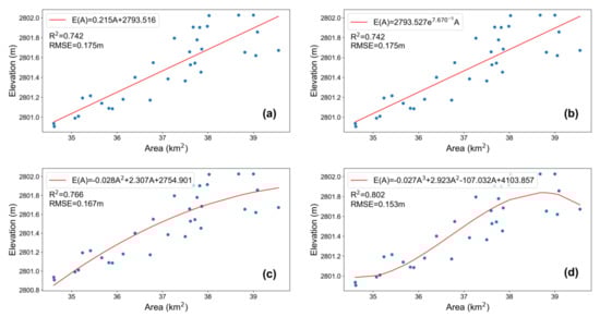 Gahai Lake water level plotted versus lake area: (a) linear curve, (b) exponential curve, (c) quadratic curve and (d) cubic curve.