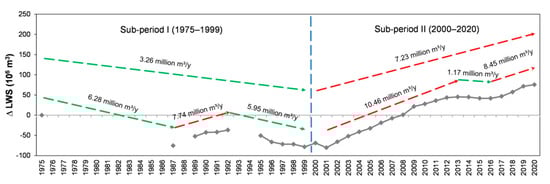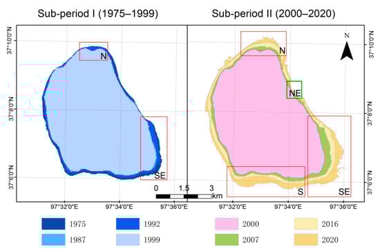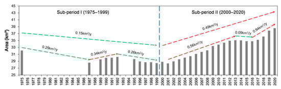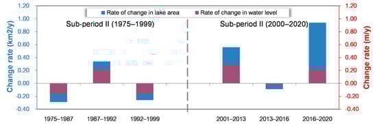 To summarize, during the first sub-period (1975–1999), the lake area was decreasing slightly. During the second sub-period (2000–2020), the lake area increased at a relatively high rate, especially in recent years. The high increasing rate in the lake area (up to threefold greater than the previous period) distinguishes the later period from the previous one.