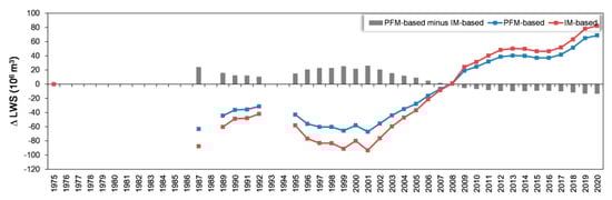 The second sub-period (2000–2020) saw a steady increase in water storage. It increased by 1.45 × 106 m3 (+7.23 × 106 m3/y). From 2001 to 2013, water storage increased for 12 consecutive years, with a total increase of 1.25 × 106 m3 (+10.46 × 106 m 3/y). The water storage in 2008 was the same as in 1975. From 2013 to 2016, the water storage changed slightly, decreasing by 3.52 × 106 m3 (−1.17 × 106 m3/y). During the period 2016–2020, water storage rose by 33.82 × 106 m3 (+8.45 × 106 m3/y), which was slower than that from 2001 to 2013, but similar to the growth rate from 1987 to 1992. These results differ from those for the area and water level of the lake during the same period, which again confirms the conclusion drawn in Section 4.3.2.