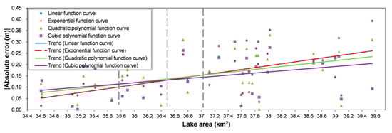 Figure 18 shows the results of the leave-one-out cross-validation of various hypsographic curves. The x-axis shows the area from the time-matched data pairs used for testing, and the y-axis shows the value of absolute error in water level (for ease of analysis). The results are divided into four sections based on the trend of the absolute error of the curve for a given area. In the first section (34.60–35.78 km2), the linear curve (blue solid line) and exponential curve (red dashed line) produce the smallest mean absolute error (0.066 m), followed by the quadratic polynomial curve (0.077 m), and the cubic polynomial curve (0.092 m). In the second section (35.78–36.49 km2), the cubic polynomial curve gives the smallest mean absolute error (0.076 m), followed by the linear and exponential curves (0.114 m) and then the quadratic polynomial curve (0.123 m). In the third section (36.49–37.02 km2), both the linear and exponential curves give mean absolute errors of 0.188 m, and the other two curves give 0.193 m. In the fourth section (37.02–39.55 km2), the cubic polynomial curve gives the smallest mean absolute error (0.176 m), followed by the quadratic polynomial curve (0.189 m), the linear curve (0.197 m), and the exponential curve (0.197 m). In addition, over the entire range of lake-area values (34.60–39.55 km2), the smallest mean absolute error was produced by the cubic polynomial curve (0.146 m), followed by the quadratic polynomial curve (0.157 m), the linear curve (0.158 m), and the exponential curve (0.158 m).