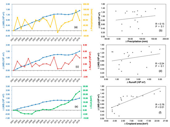 The left column shows variations in water storage plotted along with (a) variation in precipitation, (c) variation in runoff volume, and (e) variation in cropland cover relative to 2001. The right column shows the water storage as a function of (b) variation in precipitation, (d) runoff volume, and (f) cropland area relative to 2001.