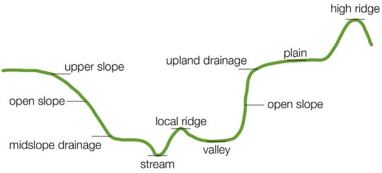 A schematic depiction of the morphological classes detected by the SAGA GIS module Topographic position index-based landform classification.